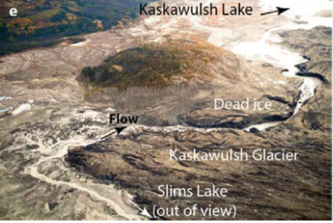 Formation of dead ice at the toe of Kaskawulsh glacier led flow to change of direction and acted as a wall to Slims river. The dead ice is actually a part of the glacier that has collapsed. As it doesn't flow anymore, glacial and fluvial sediments cover the dead ice with time and can act as a barrier for stream flows.