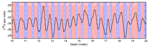 The picture above shows the variations in isotope O18 in an ice core and the delimitations of annual years. Annual layers are determined by analysing the concentration in isotope O18: then a one year layer typically starts with a low concentration of O18 (winter), then the high concentration in O18 (summer) and finally low concentration of O18 starting October. Finally, the number of layers is calculated and a time scale for the ice core can be found. An example can be found with the study of an ice core from the Vostok glacier.